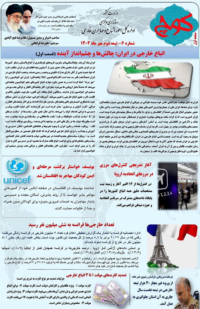 ششمین شماره نشریه کوچ که به صورت دو هفته نامه توسط اداره کل دفتر امور اتباع و مهاجرین خارجی  منتشر می شود، به پیوست می باشد.