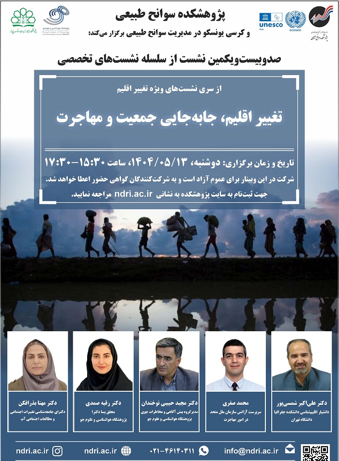 به اطلاع می رساند صدوبیست و یکمین نشست از سلسله نشست های تخصصی و از سری نشست های ویژه تغییر اقلیم با عنوان "تغییر اقلیم جابه جایی جمعیت و مهاجرت " در روز دوشنبه مورخ ۱۴۰۴٫۰۵٫۱۳ ساعت ۱۵:۳۰ الی ۱۷:۳۰ توسط پژوهشکده سوانح طبیعی و کرسی یونسکو در مدیریت سوانح طبیعی و با حضور سخنرانان ذیل به صورت بر خط برگزار می گردد.