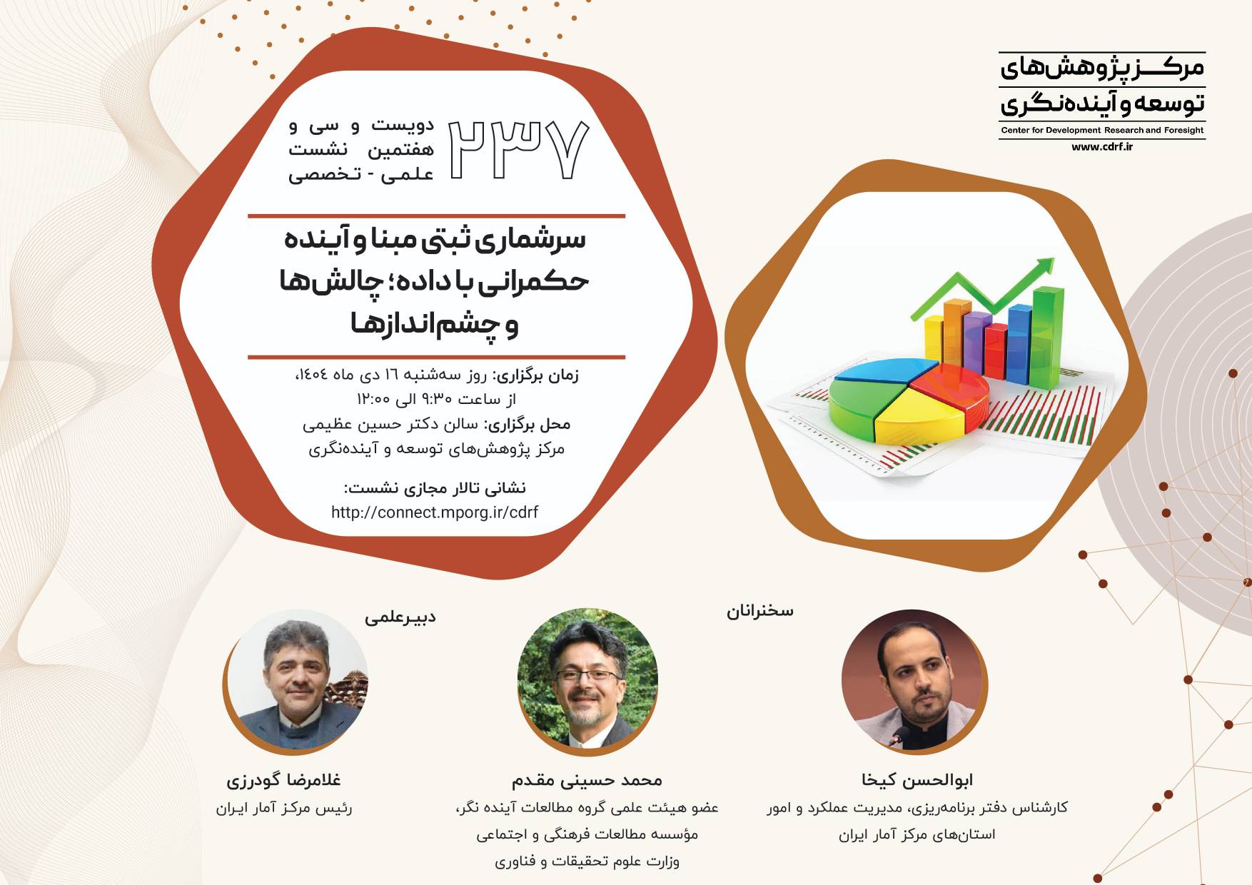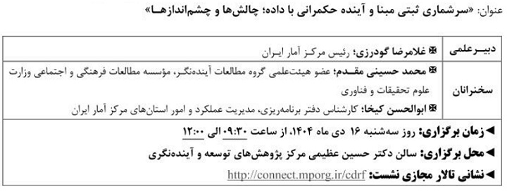 نشست علمی سرشماری ثبتی مبنا آینده حکمرانی با داده ۱۴ دی ۱۴۰۴ | ۱۰:۲۱ کد : ۵۷۴۱۸ اطلاعیه ارسال به دیگران نام شما ایمیل شما ایمیل دریافتکننده ارسال انصراف تعداد بازدید:۴۵۹ دویست وسی وهفتمین نشست علمی - تخصصی با عنوان سرشماری ثبتی مبنا آینده حکمرانی با داده، چالش ها وچشم اندازها